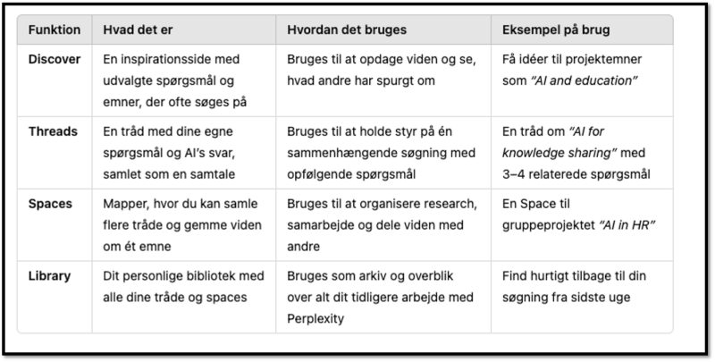 Se hvordan Perplexity kan bruges i skemaet herunder, hør videoen om Perplexity og læs også hvordan du åbner Canvas, som giver et godt overblik i skriveprocessen.